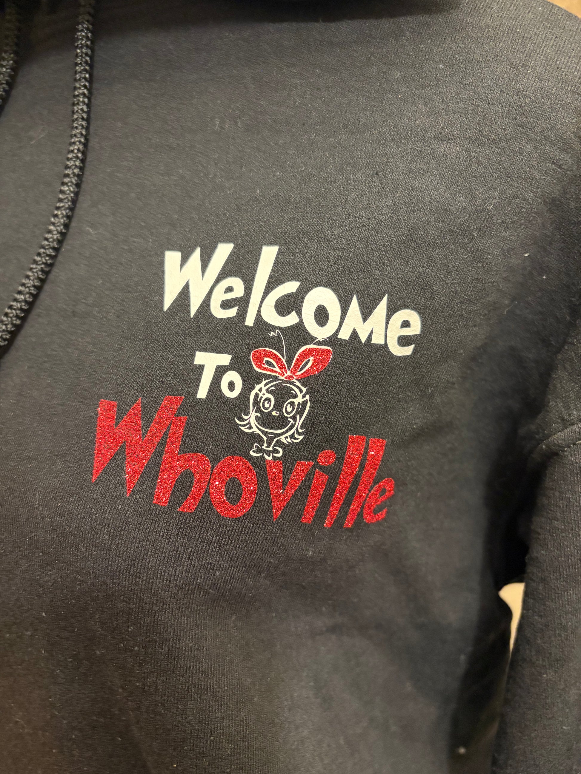 Embrace the holiday spirit with a cheeky twist in our black hoodie featuring the iconic Grinch face on the back. Perfect for those who love a bit of festive mischief, the hoodie also displays a charming "Welcome to Whoville" message alongside an indie Lou on the breast pocket area. Whether you're getting into the Christmas spirit or channeling your inner Grinch, this hoodie is the perfect blend of cozy comfort and playful style, ready to make your holiday season extra memorable.